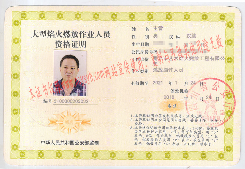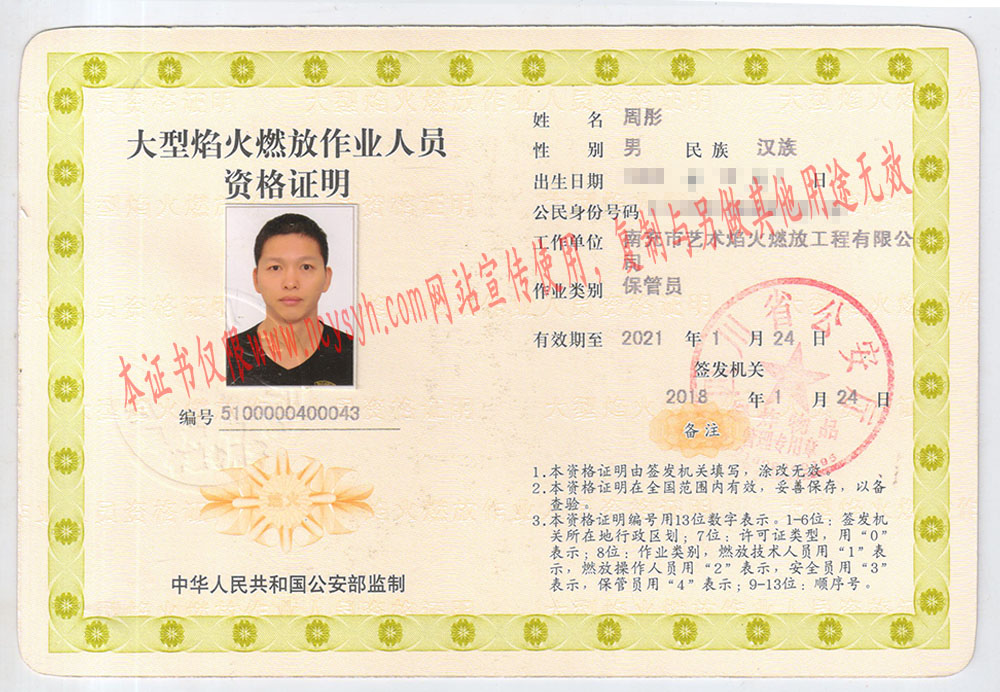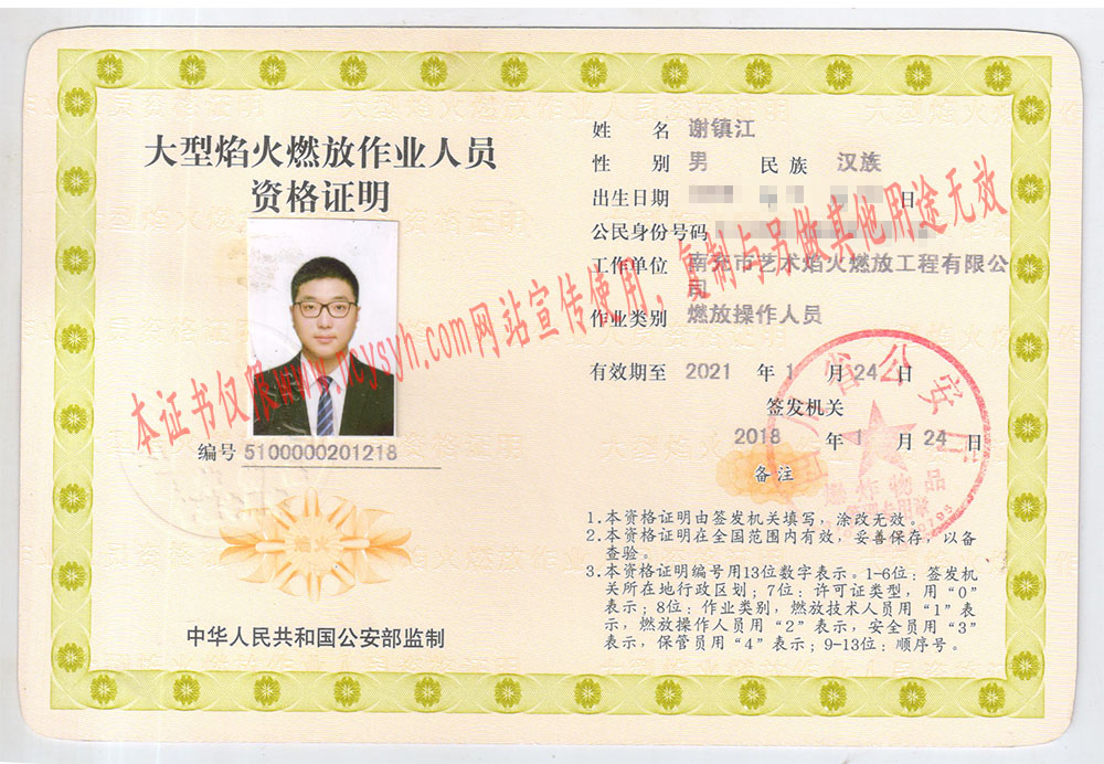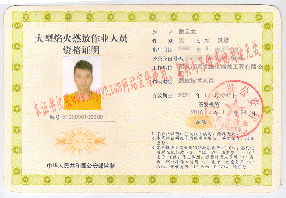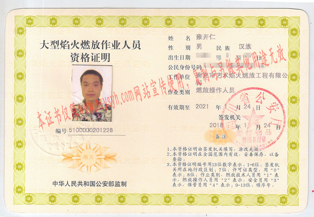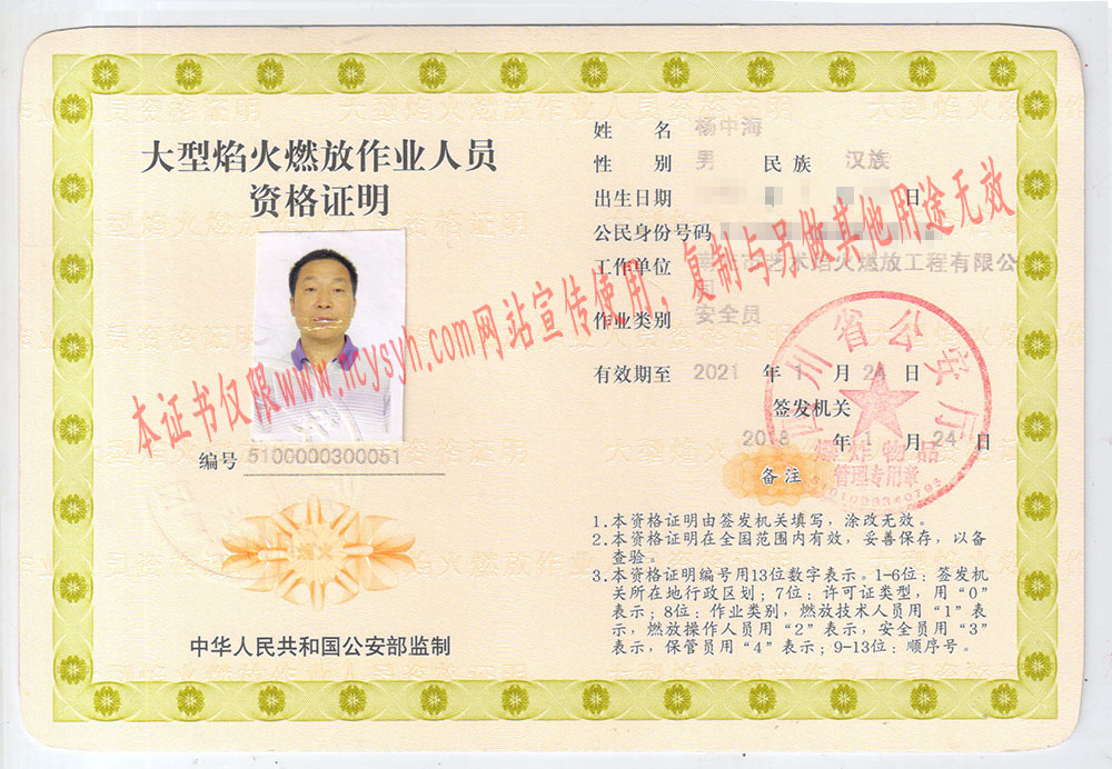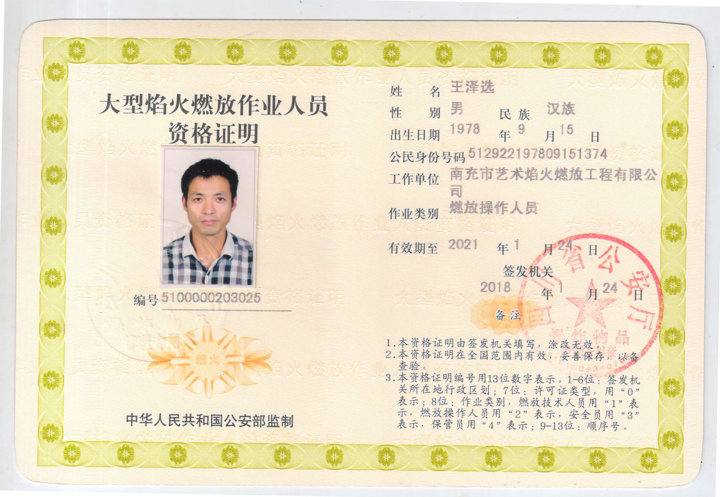 南充市艺术焰火燃放工程有限公司大型焰火燃放作业人员资格证明